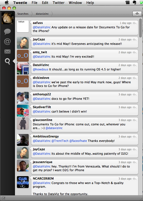 Mid-May is the approximate launch date of the iPhone version of Documents To Go, pledged by the developers a few weeks earlier, thence its frequent reocurrence in the Twitter posts on the subject. About 80% of the Twitter posts to @DatavizInc are iPhone-related. That's while the application hasn't even been launched on iTunes yet (its introduction, however, is expected any day now).