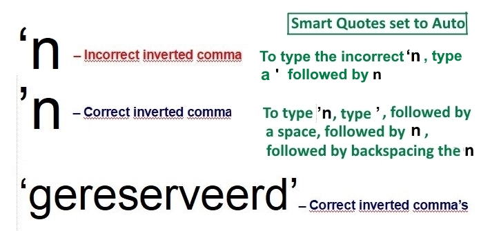 The following, very commonly and regularly used Afrikaans word has the inverted comma turned the wrong way around when it is typed into a Textmaker document: 'n. The word 'n has exactly the same meaning and use as the word (the article) "a" in English, e.g. "a car", "an empty cup", "a dollar note". etc.