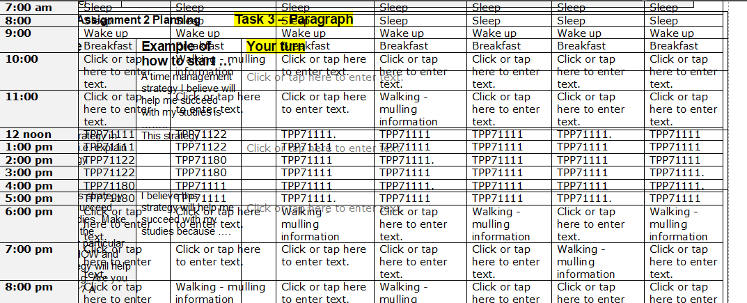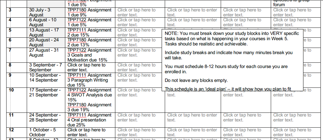 #1: On page 6 select the table "TEMPLATE: Assignment 2 – Planning. Task 2- Week 5 schedule" and set the wrap mode in the table properties/Layout to 'None'