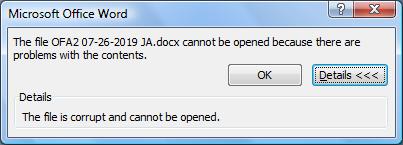 MS Word claims TM file corrupted