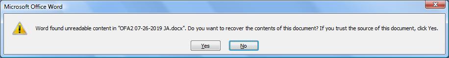 Although Word complains, if I tell it to proceed the document will open, although I get the following message...