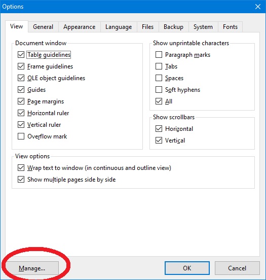 OK, I have no Options tab on my File menu. The only Options tab I have is on the Tools menu and that has no Manage tab. Perhaps I should mention that I have the free version of TextMaker?