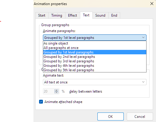 Thank you for posting your query. To achieve this, please change Animate paragraphs option of Text tab of Animation properties.