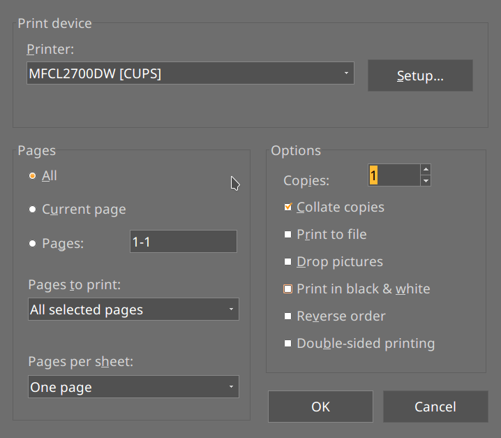I will open a feature request to implement the option for long or short edge.vtpoet wrote: Fri May 25, 2018 2:38 am Yes, there's a checkbox for double-sided printing. But that's not the issue. The problem is that there's no way to control whether the document is printed on the long or short edge (Duplex Tumble or Duplex No Tumble). If I choose "Setup" from your print dialog box, that also fails to provide an option.