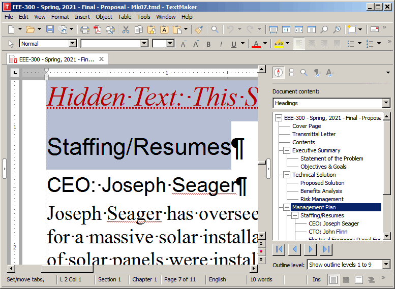 In the first photo (“TOC - CTRL-Left-Clicking on Executive Summary.png”) I’m about to [Ctrl]+[Left-Click] on the TOC entry for “Executive Summary.” On the document map you can see that there is such a header. Unfortunately, as shown in the second photo ("Management Plan - Wrong Section, Unwanted Highlighted Text.png"), after I [Ctrl]+[Left-Click] I am taken to “Management Plan,” “Staffing Resumes.” Even the document map indicates that this is the wrong destination. Also, for no obvious reason, TM has selected a block of text.