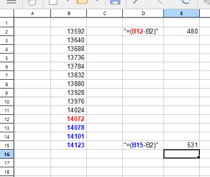 How do I reference the red and blue cells, the values in B will be added to at no fixed date and time so I can't predict B12 or B15.