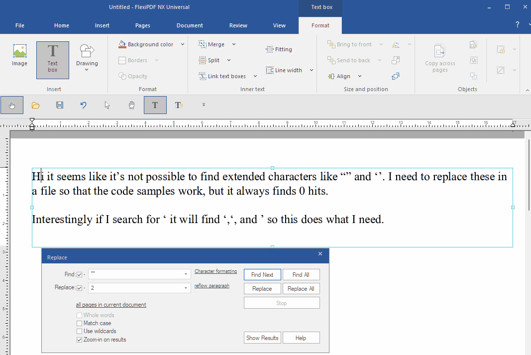 Hi it seems like it's not possible to find extended characters like “” and ‘’. I need to replace these in a file so that the code samples work, but it always finds 0 hits.