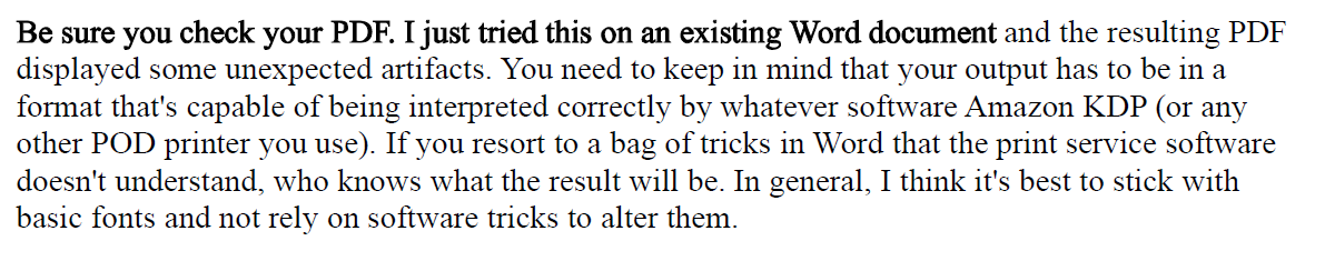 I participate fairly regularly on an Internet forum for authors. A forum member recently posted about not being able to find a font that seems to be a perfect match for a printed book whose interior design (typesetting) he wanted to emulate. The font was Garamond, but he said all the versions he tried looked a little lighter than the book whose appearance he wanted to match. He then discovered a feature in Microsoft Word that allows using an outline to increase the visual thickness of the strokes in a font.