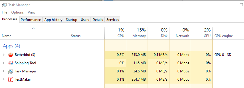 Switching from TextMaker to Brave or Vivaldi browsers or BetterBird email client seems to dramatically increase the times TextMaker becomes a Dementia patient, you can see it sitting there looking at you, but it has no idea what is going on. Spending time in VS Codium or Diamond text editors making notes or whatever does not seem to give TextMaker Dementia.