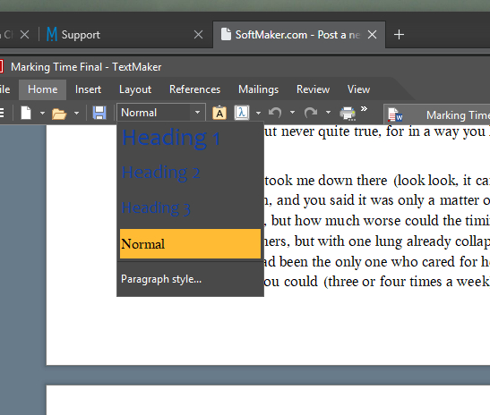A small but mildly irritating thing which I think would be easy to correct (it was happening in the beta in the main ribbon drop downs and you've already put it right there). If I add a paragraph style button to the Quick Access toolbar (ribbon interface, dark theme) the background to the dropdown is dark, making it hard to read the style options until you hover the mouse over each and an orange highlight shows behind (screenshot attached).