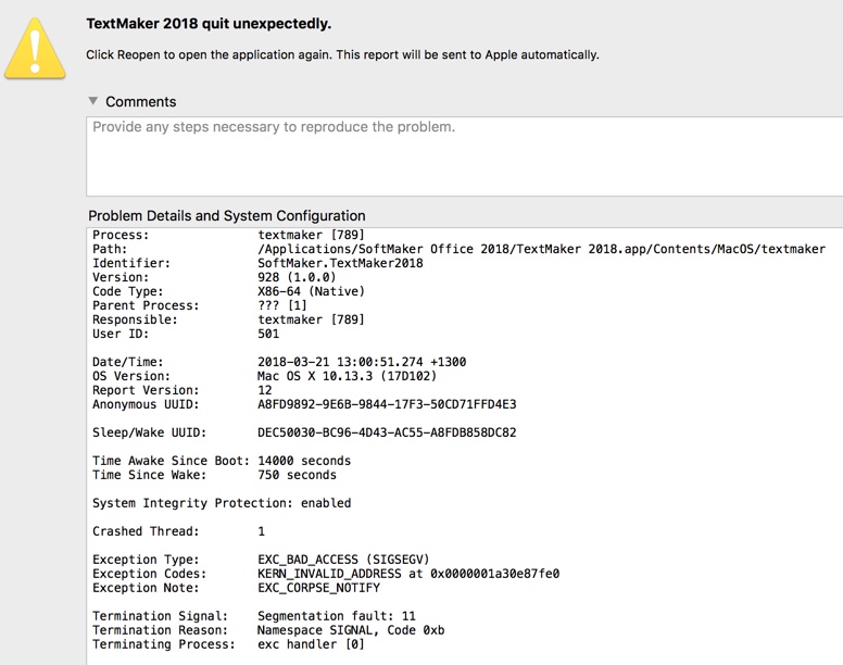 Another crash in TextMaker, this time after selecting text and then going to "Convert text to Table" from the Table menu. Crashed when clicked on "Convert...".