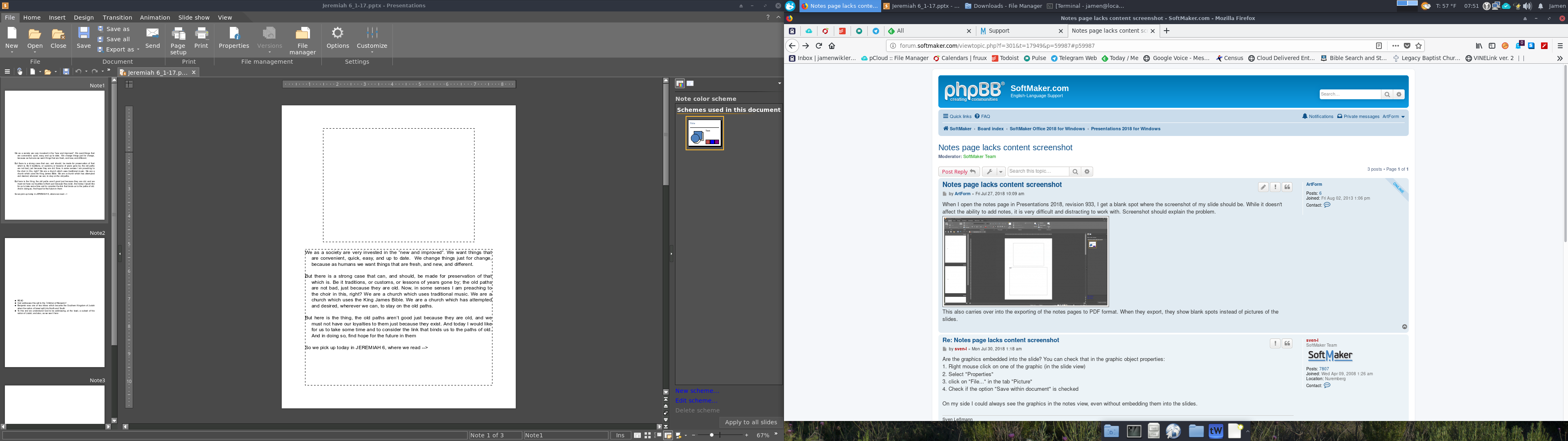 This is the content of my slides: And this is the content of my notes pages: I am, by the way, reproducing this error in Linux at the moment, revision 933, so the problem is in both Linux and Windows versions. I might wonder, once again, if it has something to do with my multi-monitor setup? And it isn't just about displaying wrong. If I attempt to export my notes pages to PDF, the slides appear as blank. That file is attached as well for proof.