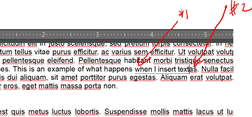 In this image you can see at #1 the text is inserted slightly below the line before it. This is more pronounced when I have the computer oriented in portriat mode but I have trouble capturing the image in that mode so I am using landscape. Nevertheless you can see the slight difference here. And when inserting it types over the existing text rather than moving the text as would happen normally. So you can see a bit of that at point #2.
