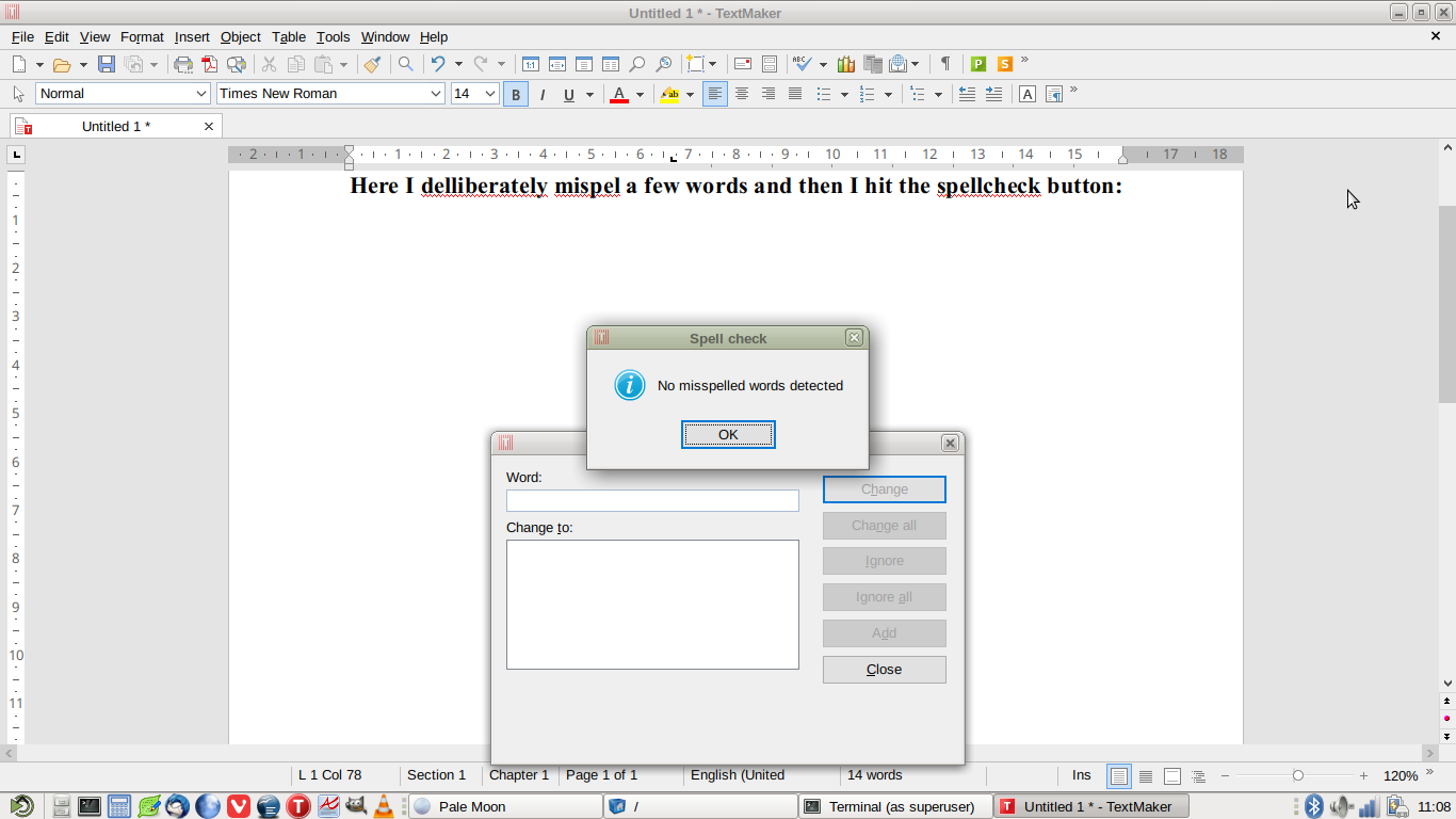 If I have written a sentence or paragraph and want to check for spelling errors I've noticed that if I hit the spellcheck button, or F7, with the cursor at the end of the written sentence/paragraph, TM does not detect spelling errors (see attached screenshot). If I move the cursor to the beginning of the text I want to check, it works as it should. If I double-click on a word and hit the spellcheck button/F7, spelling errors are also detected.