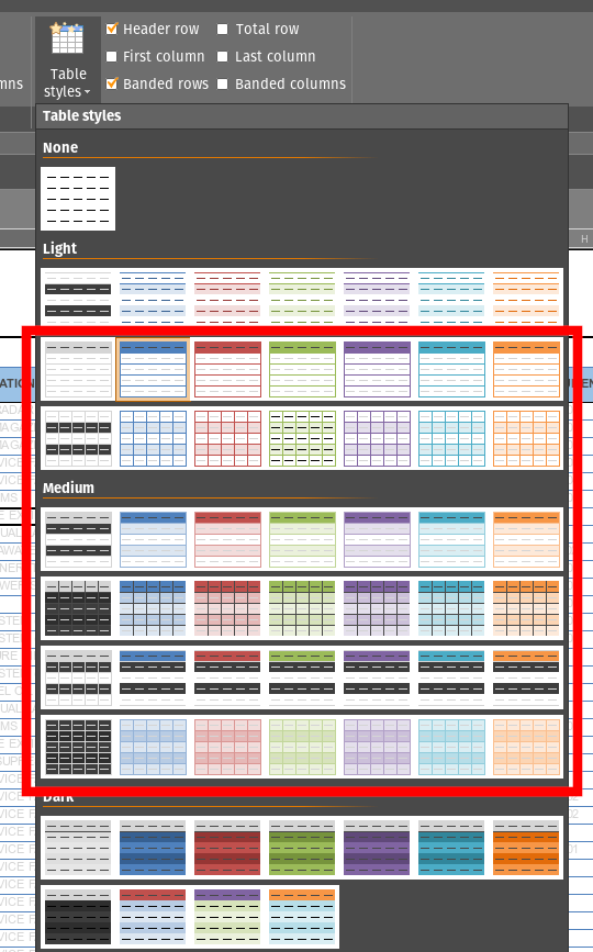 Table Styles has grey text instead of black.