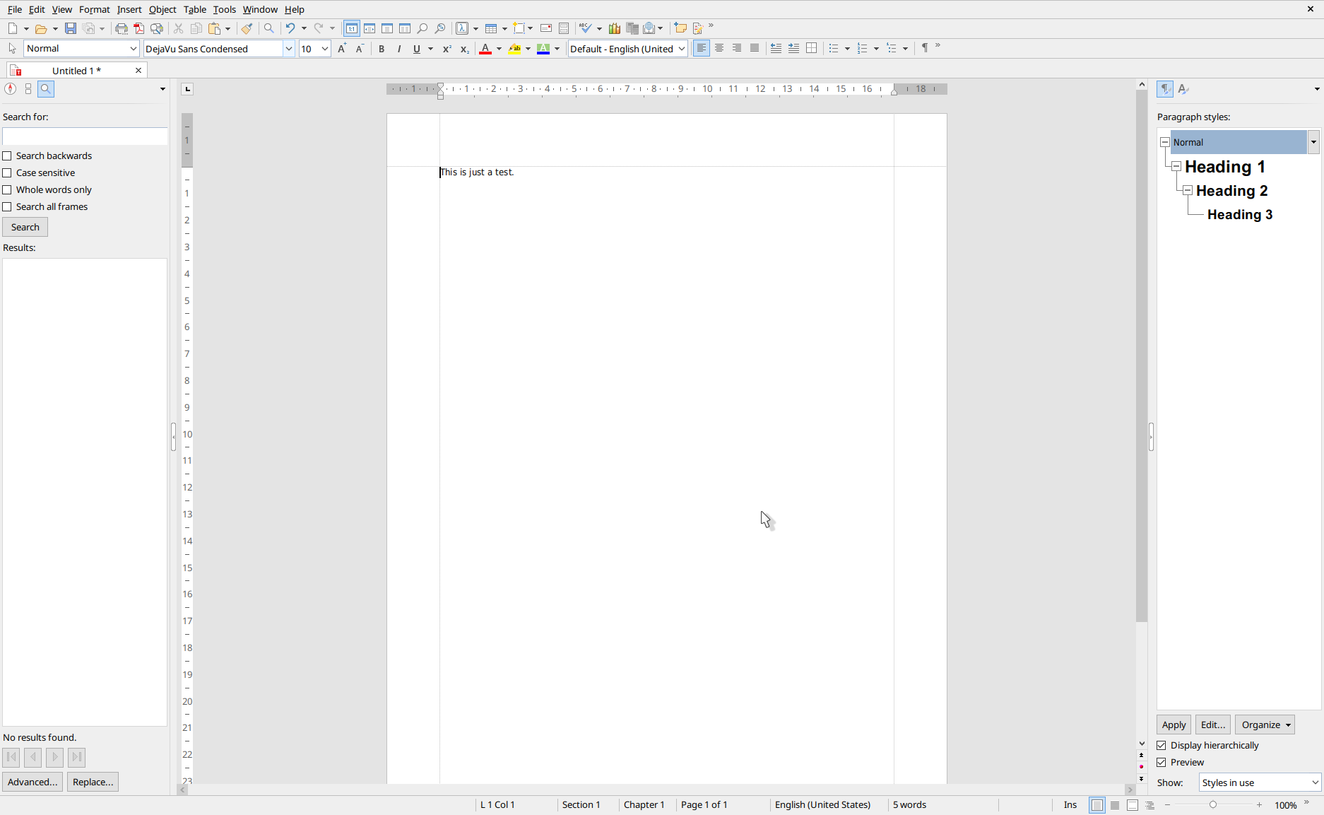 3. Press Ctrl+F once - The contents in the left side panel switches to the "Search ..." form, but the text cursor is still active at the beginning of the test sentence (see screenshot 2)