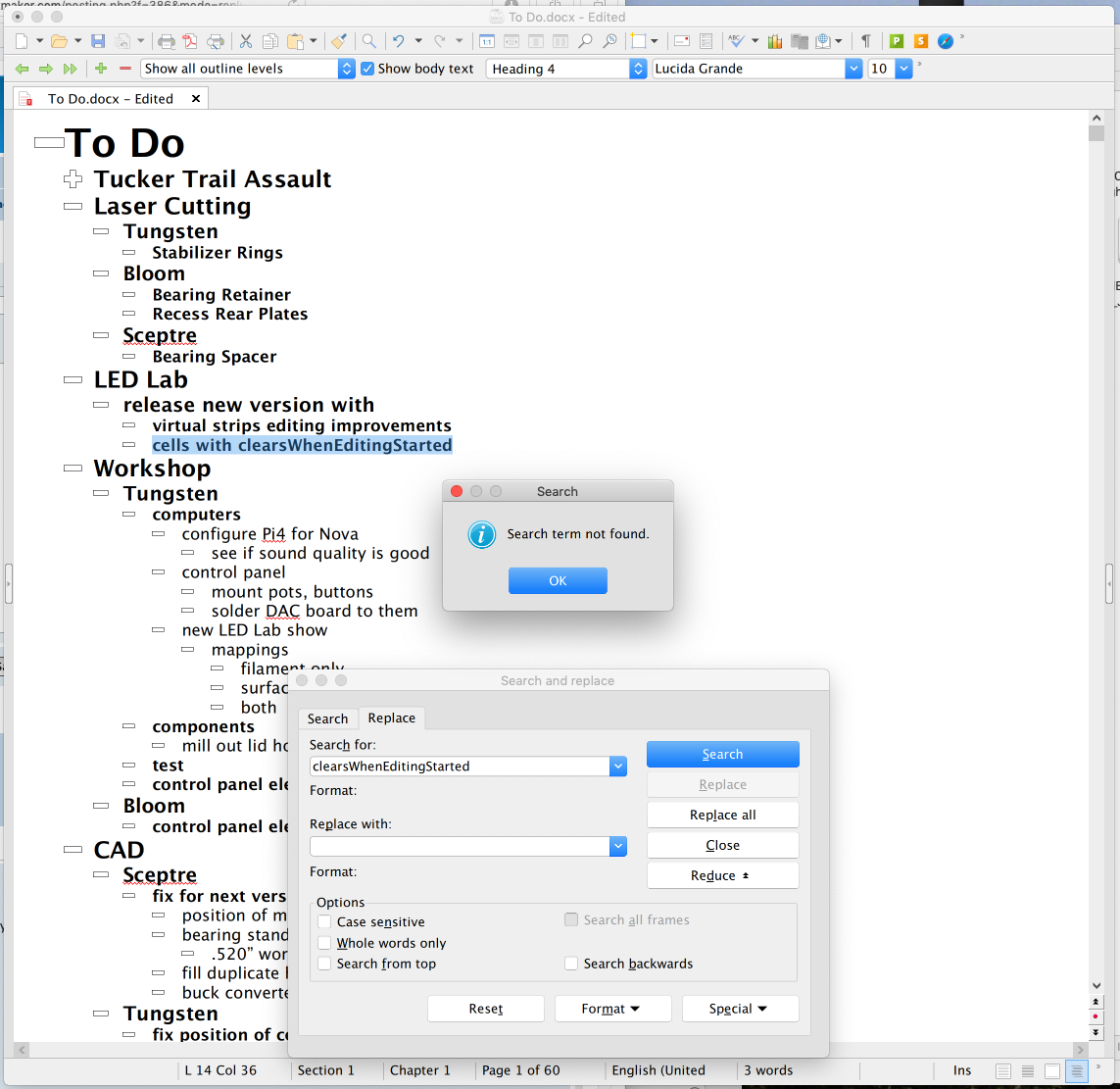 captainping wrote: Fri Jan 22, 2021 6:47 pm 3) In the Search or Replace Dialog, if the current selection is past the last instance of the search string, the dialog says “Not Found”. The dialog should provide the option to search from top if selection was not at the top. This could be in the form of an alert asking if the user would like to start searching from the top (as Word does). Or it could be in the form of a "wrap around" checkbox in the dialog whose state is remembered. Simply saying "Not Found" is the worst possible option.