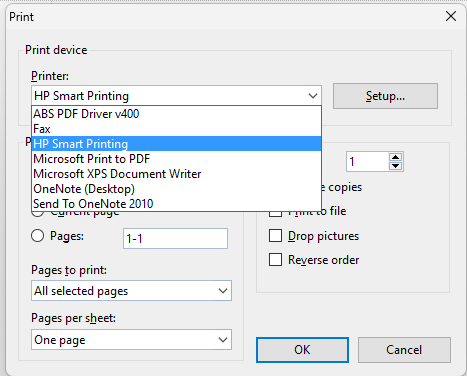 3. After selecting the correct printer, please click on Setup button which is next to printer list and check if that setup dialog box open for the selected printer correctly.