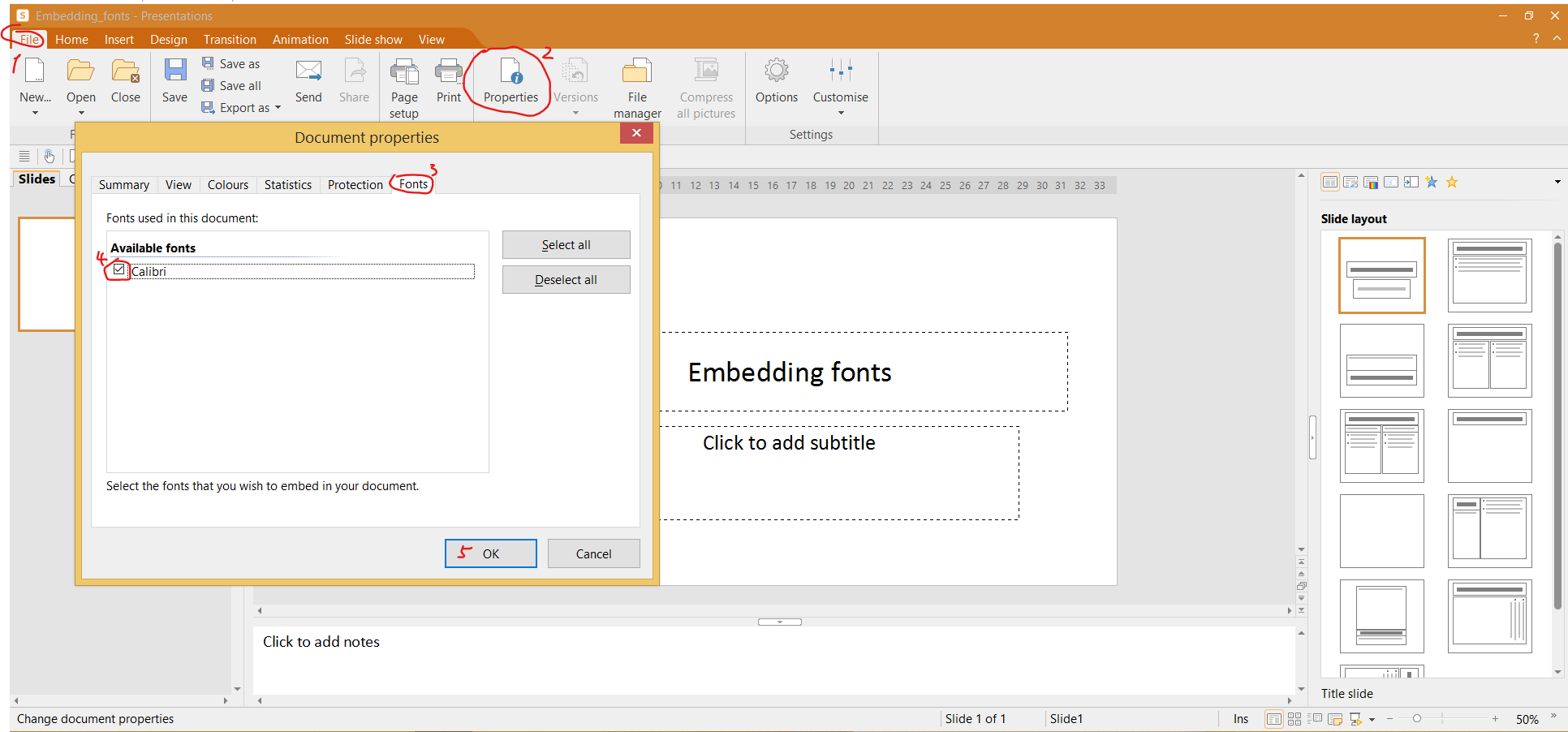 To test embedding of fonts you should proceed as shown in the screenshots. You save the presentation in PowerPoint 2007-2021 slide show (*.ppsx) format that is supported on almost any modern presentation program. You have to embed fonts in that presentation file. Invoke File>Properties... select tab Fonts and mark all fonts to be embedded.