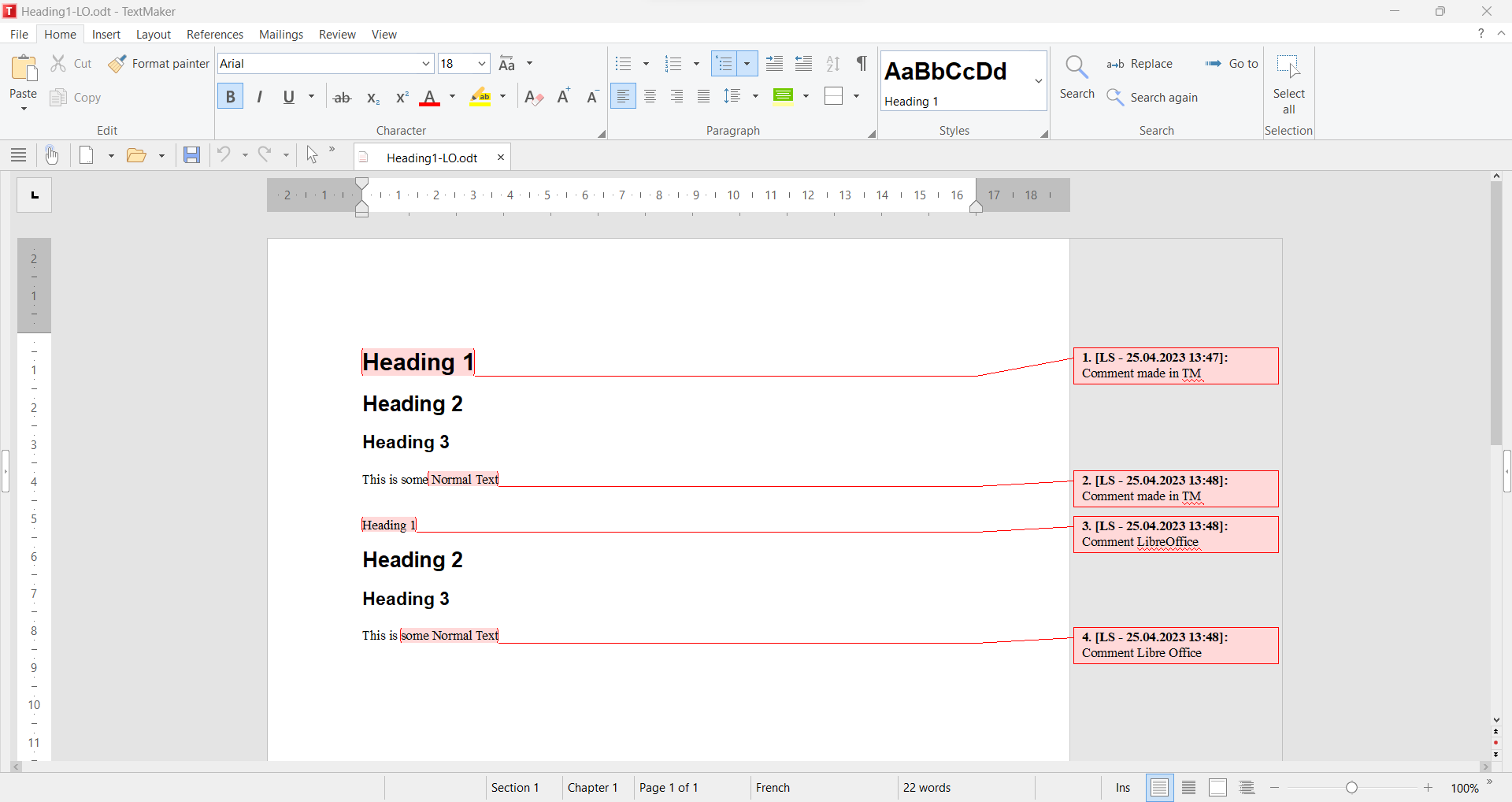 The file Heading1-TM, was created with TM. Comments where added with TM too. The file Heading1-LO was created in TM, modified in LibreOffice (Text and comments added).