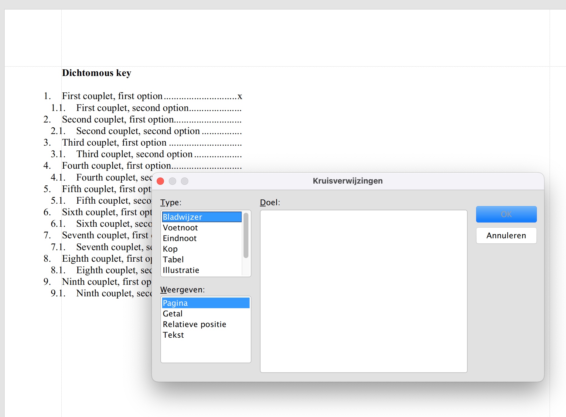 TextMaker is fast and responsive on my Intel Mac, but when try to enter a Cross Reference (in my Dutch version 'Kruisverwijzing') an empty window is displayed. The list Type, at the upper left, and Display (Weergeven) at the lower left, show several items, but no combination of choices triggers anything in the Target window (Doel). Cross References are ideal to insert links in dynamically numbered lists. Adding a new item to the list corrects the numbering automatically, while the links remain working correctly, at least in the word processors of the competition.