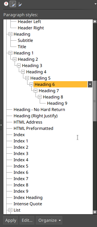 So... I'm still not able to delete any styles following your instructions (which I think is what I'd been doing all along). I even tried to open the default template *as* a template in order to delete (declutter) unused styles. Can't do it. I choose delete. The list bounces back to the top. When I scroll down, there they all are. And now I can't delete them (the delete option is greyed out) but they're still there. Attached are all the styles I'm dealing with. I don't need all those "Header" or "Index" styles for example. It's a mess.