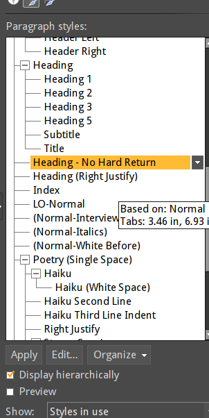 2. Okay. I'll try editing Normal.tmvx. However, as has emerged in this thread: The real issue is that Softmaker should behave like Word and LO and only list those style --- "in use" --- that are actually being used in the document. This would solve the whole problem I'm having.