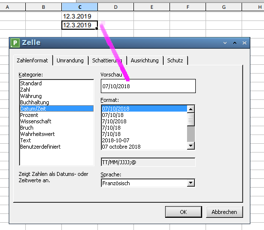 Screen Shot with an authentic cell format. This can be called a bug (continues below the picture): I may be erring, but think that this had been a reported issue before the current releases 936 or 938. What is worse: Any attempt to overwrite the current date-format by a user-defined format fails just as well: Have a laugh, all, if this is funny.