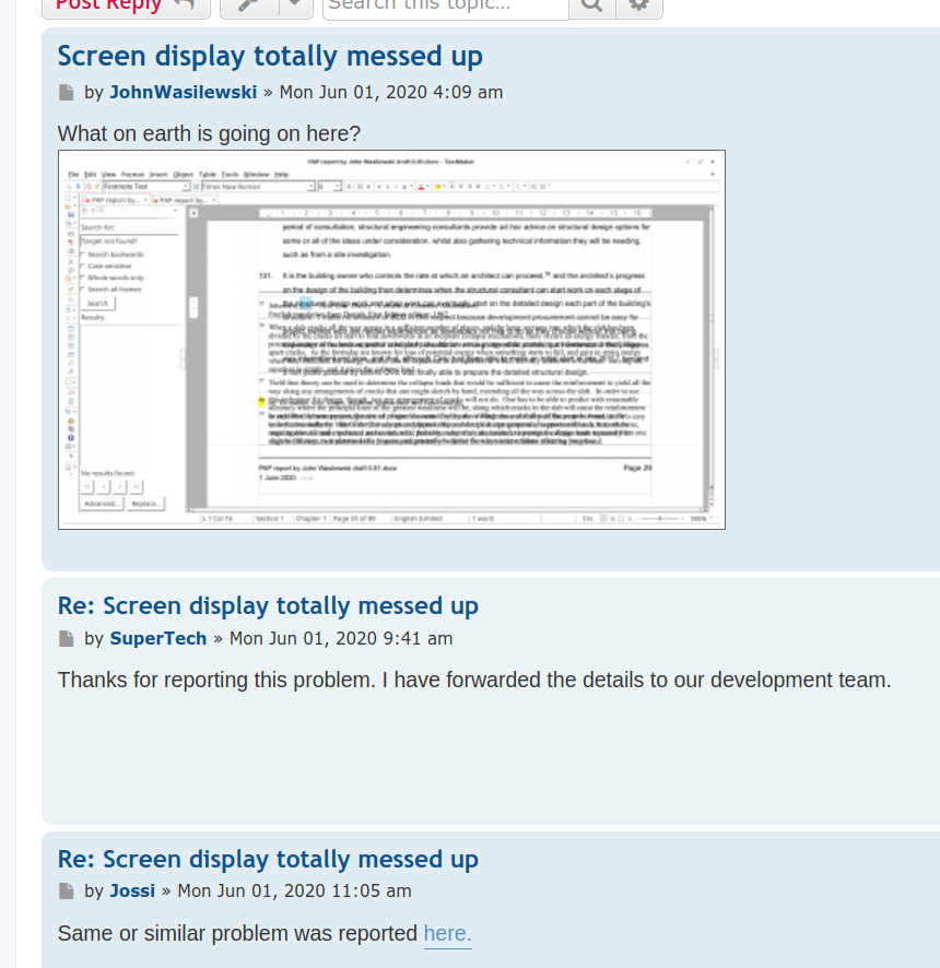 Your developers just MUST get all these bugs out for us. I know how hard software development is but your customers have supported you and trusted you. I think TM2121 is brilliant program but it is still not finished, and its faults are interfering with my work. How can I even write my reports, et alone send them to clients, when they look like this?