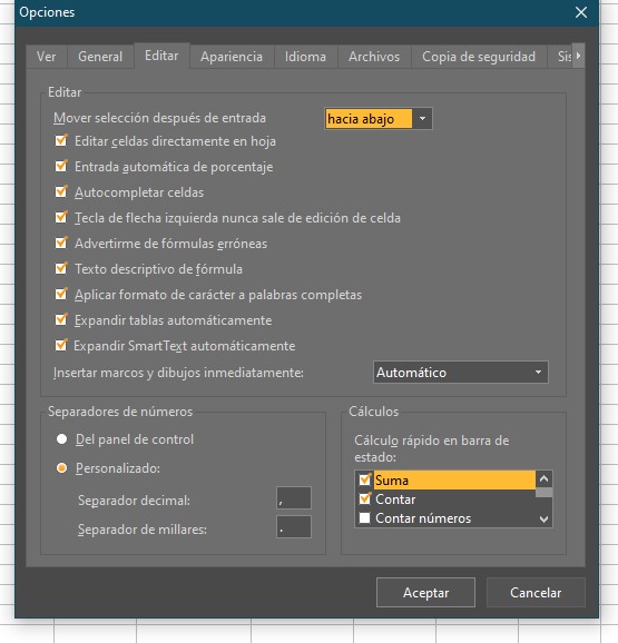 Change options in format menu only change select cells, not new cell (you need repeat change format, no have a option to save as predeterminated). ¿Not read prefered format number of Windows? Need more options of predefined format numbers in options menu.