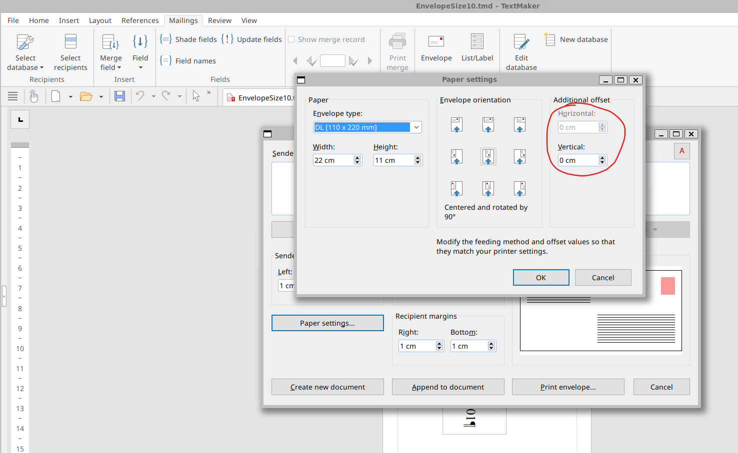 - In the 3x3 matrix of envelope radio buttons, click on the one in the very center.