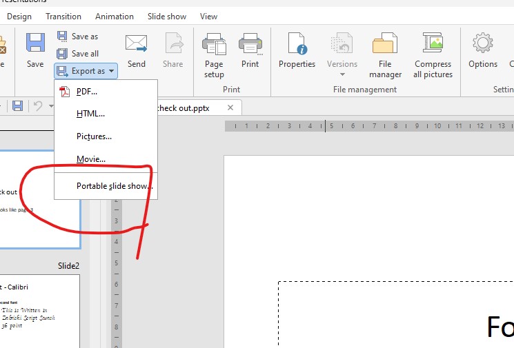 When I exported my test presentation, the set of folders was enormous; it contained all kinds of additional documents; it wanted to make alterations to the registry of the computer hosting it.