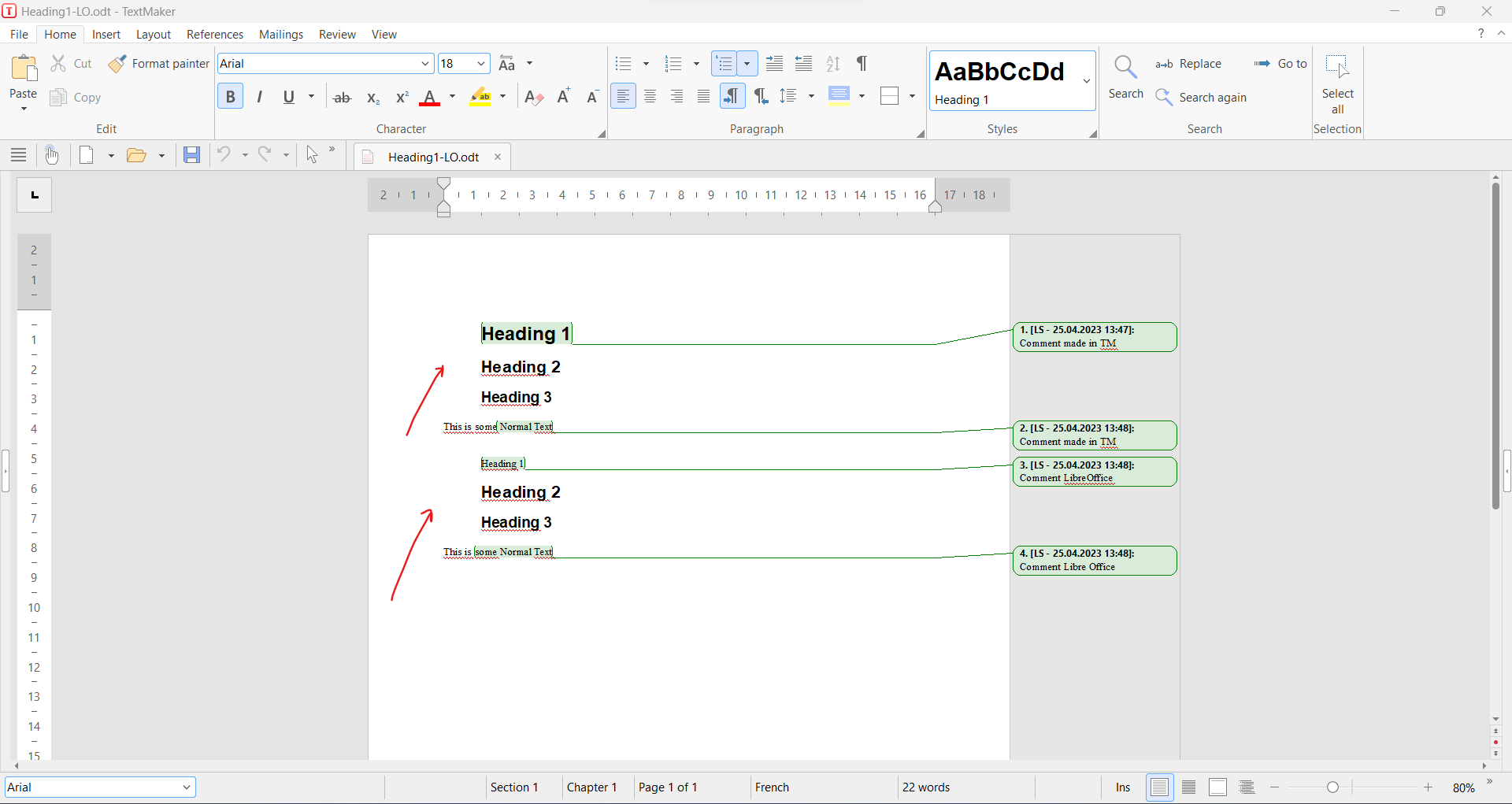 The file Heading1-TM, was created with TM. Comments where added with TM too. The file Heading1-LO was created in TM, modified in LibreOffice (Text and comments added).