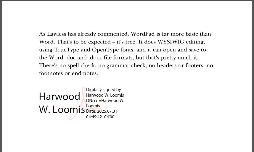 Neither FreePDF 2022 nor FlexiPDF 2022 handles digital signatures as neatly and easily as other PDF editors and readers. I'm attaching a screen shot of a PDF that was created as a text file and converted to PDF. I then opened it in Adobe Reader XI and with a couple of keystrokes and mouse clicks I was able to insert a proper-looking digital signature.